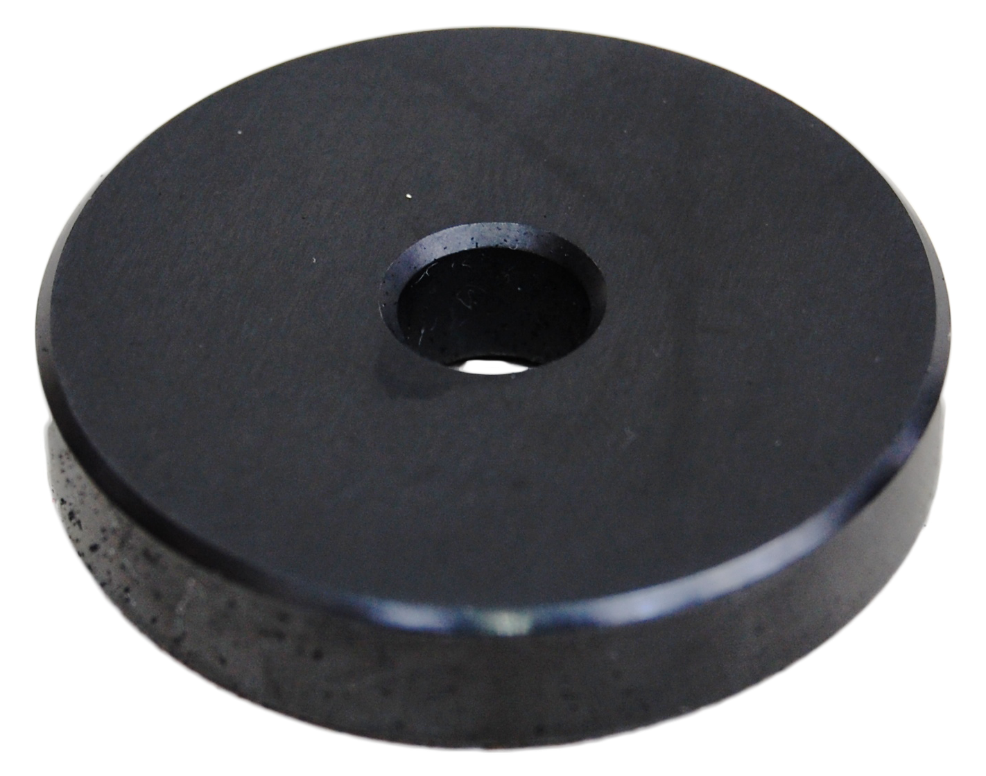 The test piece is produced as a disc with a diameter of 50 mm and a thickness of 10 mm. A drilled hole with a diameter of 10 mm is located at the centre of the block. This drilling hole serves as support of a magnetising mandrel, for which a magnetising field strength of 24 A/cm is required within the test piece.