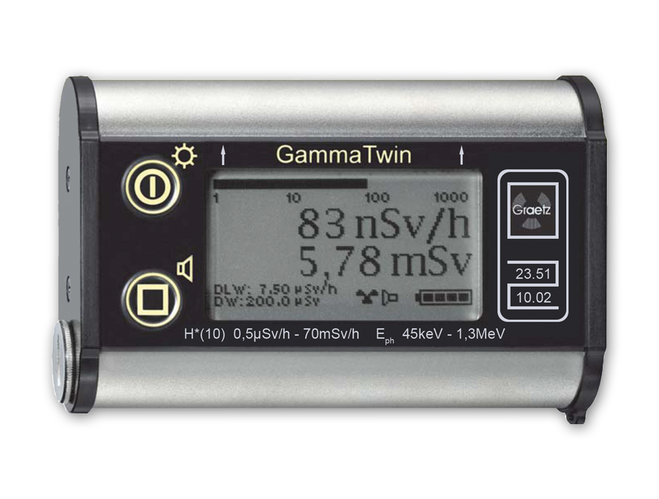 The Graetz Gamma Twin is a small and handy dose rate meter for the measurement of gamma radiation and x-rays for ambient dose rate equivalent H*(10) and ambient dose equivalent H*(10) (local dose). The Gamma Twin is PTB-approved, equivalent to this approval is NPL (UK) and NIST (USA).