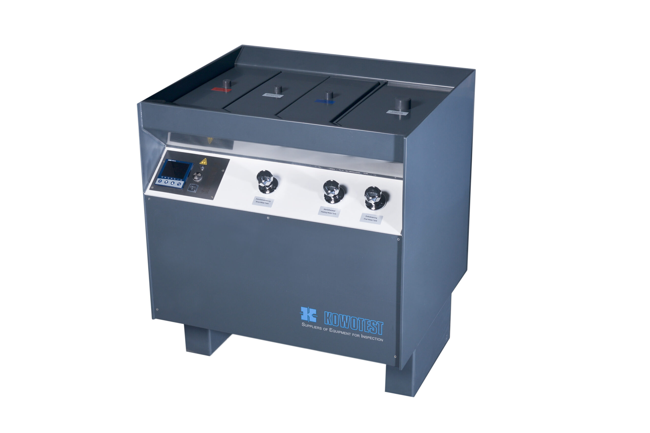 The Kowopro K31 unit is made of strong grey PVC material. These processors are designed for easy manual processing of x-ray films.  Three tanks at the left for developer, rinse water and fixer are placed in the heating tank bath which can be heated or cooled. The large tank at the right is for final wash of fixed films or also for washing channel hangers. A microprocessor controls heating and water level in heat bath tank and can also be used as a darkroom timer. For permanent fresh water supply in the rinse and end water tank there are separate water taps and over flows. The third tap is for cooling the developer and fixer if necessary.