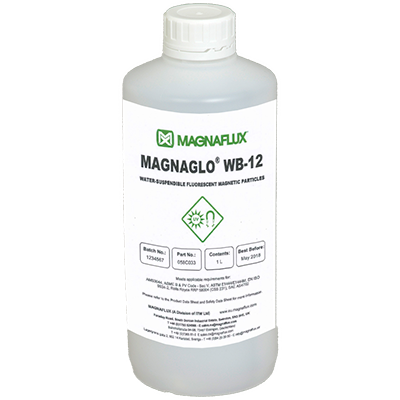 MAGNAGLO® WB12 is a liquid concentrate used to prepare water-based fluorescent inks for wet method magnetic particle testing. Inks made with WB-12 give clear bright yellow/green indications when viewed in a darkened area under UV(A) of peak wavelength 365 nm, and offer enhanced corrosion protection.